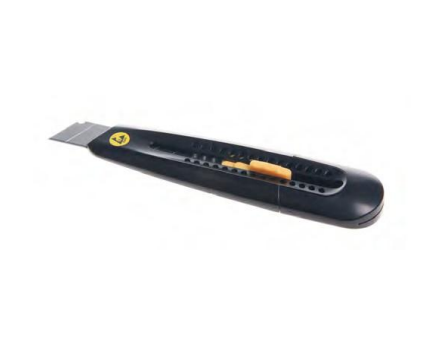 ESD tapetniški nož ali olfa nož je namenjen natančnemu in varnemu rezanju materialov v okoljih, kjer je potrebna zaščita pred elektrostatično razelektritvijo. Uporablja se v EPA območjih, proizvodnji elektronike, laboratorijih in servisnih delavnicah, kjer je pomembno preprečevanje kopičenja statične elektrike pri delu z občutljivimi komponentami. Izdelan je iz ESD varnih materialov, ki omogočajo kontrolirano odvajanje naboja ter zmanjšujejo tveganje poškodb elektronskih sklopov. Ostri in zamenljivi rezilni segmenti omogočajo natančen rez različnih materialov, kot so karton, folije ali embalaža. Ergonomska zasnova zagotavlja varno in udobno uporabo, medtem ko robustna konstrukcija omogoča dolgo življenjsko dobo tudi pri intenzivnem delu. ESD tapetniški nož je zanesljiv pripomoček za vsakodnevno uporabo v ESD zaščitenih okoljih.