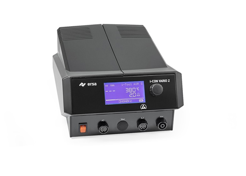 Večkanalna spajkalna in odspajkalna postaja i-CON VARIO 2 MK2 profesionalnemu uporabniku omogoča hkratno uporabo dveh spajkalnih orodij. Poleg nove, ergonomsko zasnovane enote za vroči zrak i-Tool AIR S (200 W) je mogoče hkrati uporabljati še drugo spajkalno orodje, kot je 150 W i-TOOL MK2, idealen pripomoček za klasične spajkalne aplikacije, ali na novo razvite odspajkalne pincete Chip Tool Vario (80 W). Alternativno je mogoče priključiti tudi druga spajkalna orodja Ersa. Kompaktna napajalna enota, varna glede ESD, ponuja enostaven in pregledno urejen prikaz, ki je pri družini orodij i-CON MK2 standardna lastnost. Tako kot pri večji postaji i-CON VARIO 4 MK2 so na voljo vmesniki za Ersa odsesovalnik spajkalnih hlapov ali infrardečo predgrelno enoto, prav tako pa možnost hitre in varne konfiguracije postaje z microSD pomnilniško kartico. Ta napajalna enota z vmesnikom in integrirano vakuumsko črpalko je dobavljena z napajalnim kablom (3K120KR053075).